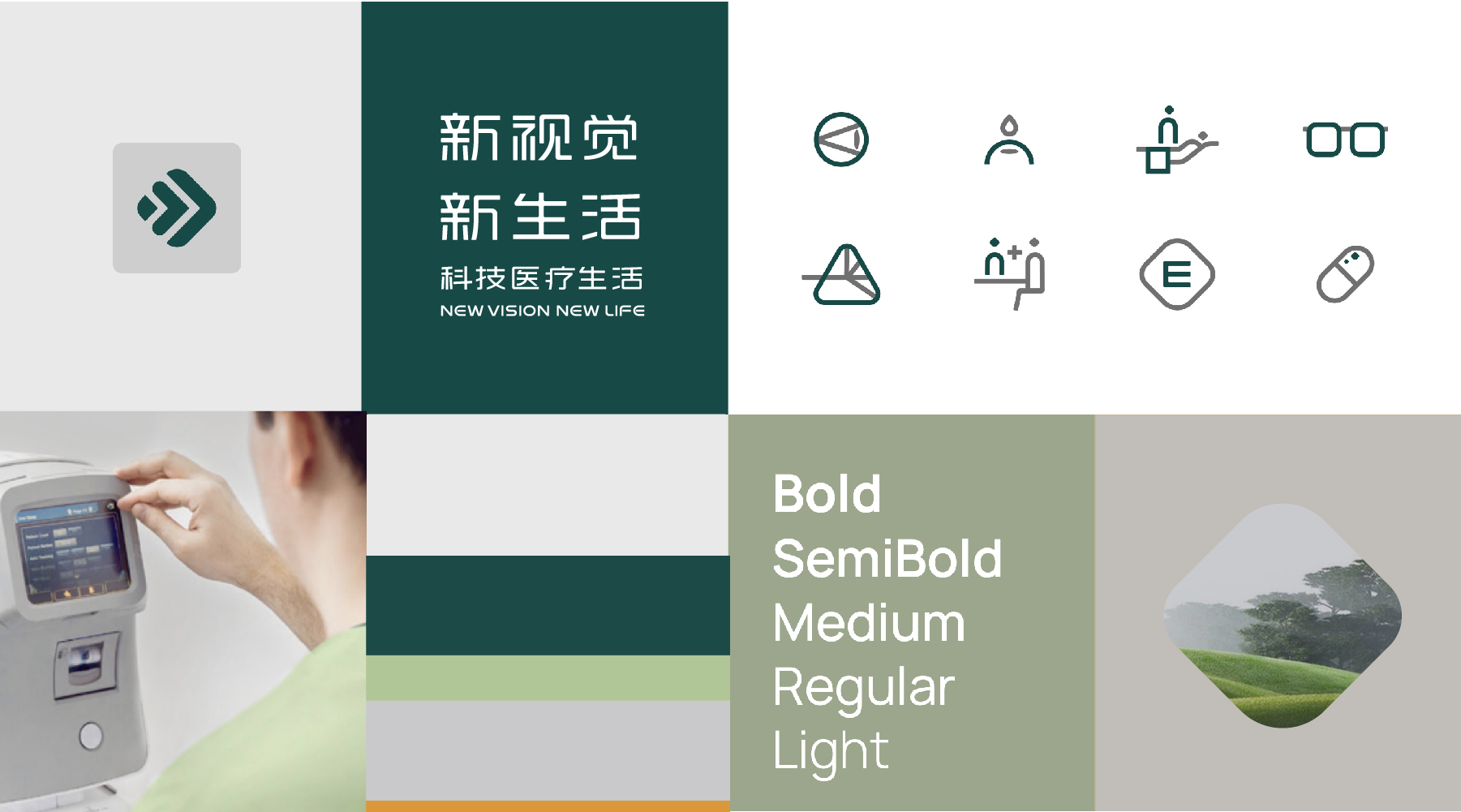 在色彩方面,我們選擇具有健康屬性和內(nèi)斂的綠色作為品牌顏色,我們把它定義為“遠(yuǎn)山綠”,它是來(lái)自蒼翠遙遠(yuǎn)山峰的顏色,自然和親切,對(duì)患者的眼睛具有友好的舒適度。同時(shí)我們也搭配了一系列舒適自然、低飽和的顏色以適應(yīng)不同接觸點(diǎn)的落地,讓整體更加豐富。