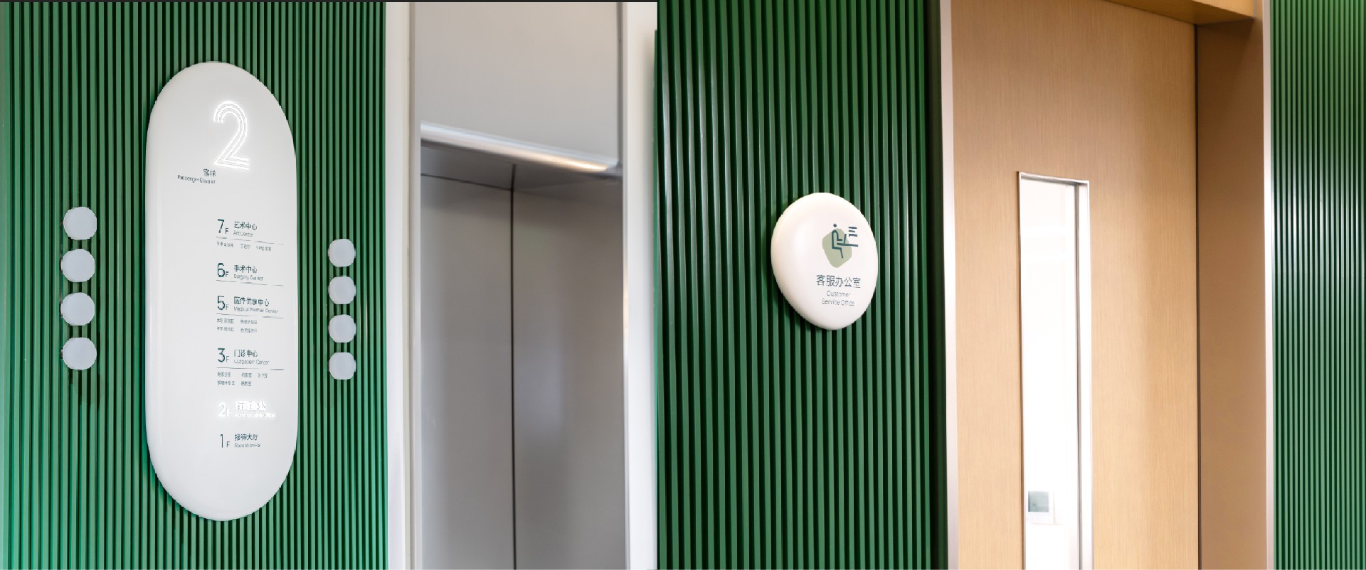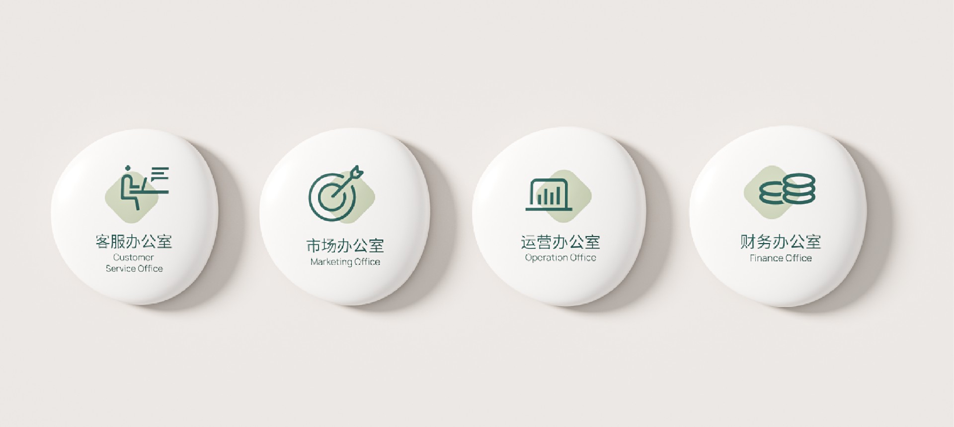 我們相對(duì)克制的把層層遞進(jìn)的科技、醫(yī)療和生活的三層關(guān)系放到了每層樓的樓號(hào)數(shù)字上隱晦的表達(dá);在每個(gè)房間的門牌上使用鵝卵石狀來(lái)強(qiáng)調(diào)呵護(hù)和治愈,減少患者焦慮;把醫(yī)療區(qū)和VIP體驗(yàn)區(qū)用材質(zhì)來(lái)迎合整體環(huán)境;把代表平臺(tái)的logo外輪廓融合進(jìn)整體icon,在員工區(qū)的icon開發(fā)上細(xì)微的增強(qiáng)了團(tuán)隊(duì)活力;在過(guò)道樓梯的電梯處使用了底紋元素;在每個(gè)樓層的前臺(tái)處按照l(shuí)ogo字體重新對(duì)中英文進(jìn)行統(tǒng)一設(shè)計(jì);單獨(dú)把logo圖形作為前臺(tái)的點(diǎn)睛之筆,所有的細(xì)節(jié)全部貫穿核心的創(chuàng)意元素,指向使命和初心的創(chuàng)意機(jī)會(huì)。