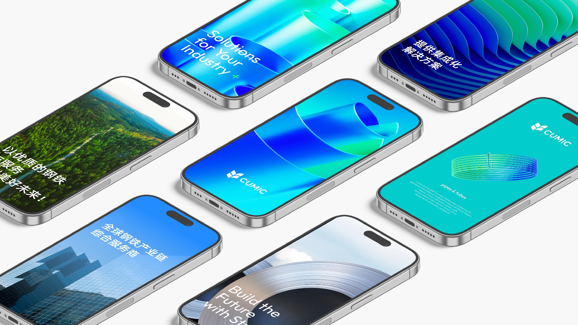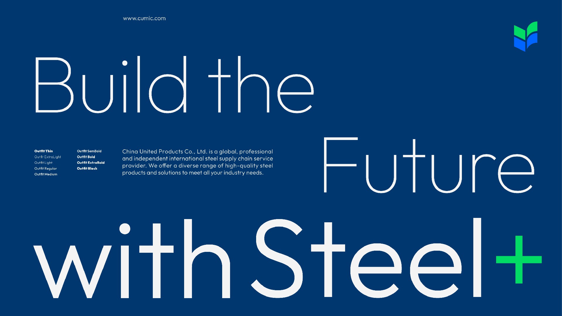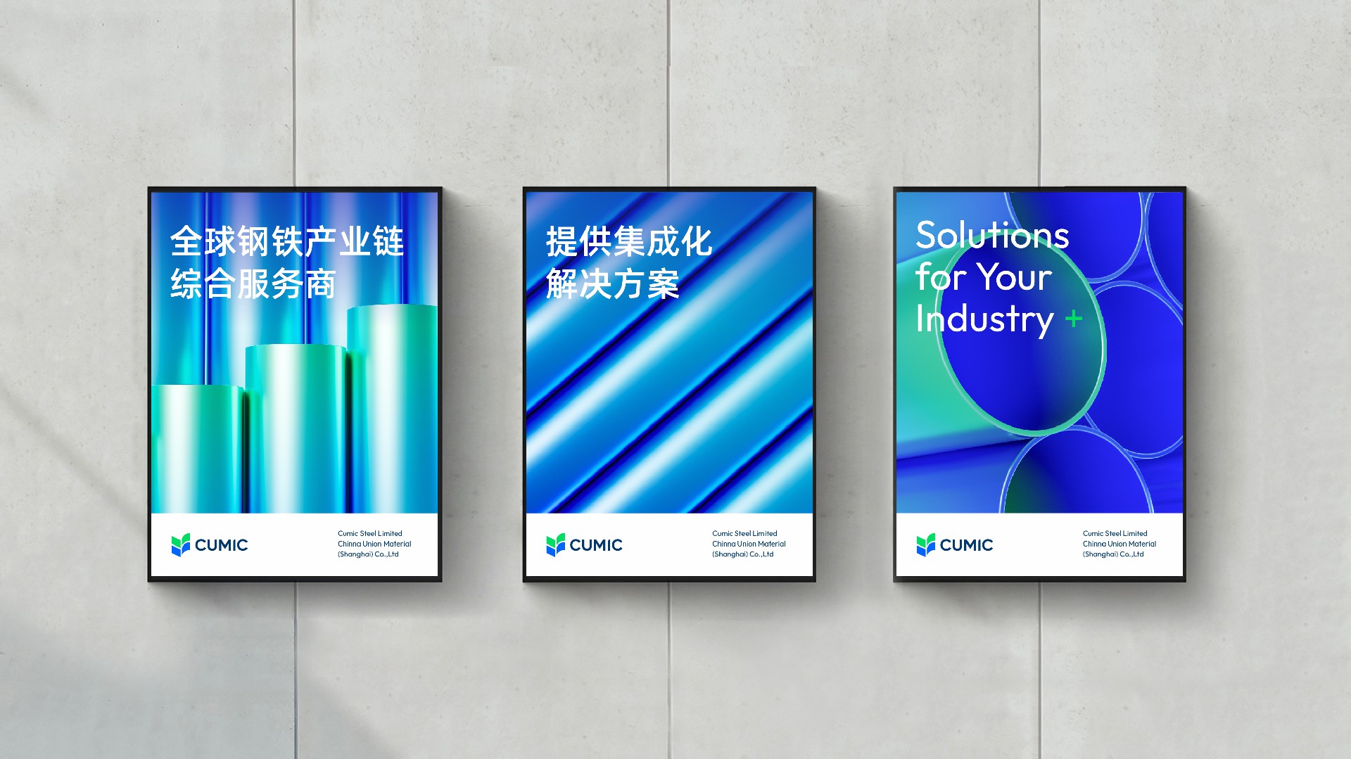 我們使用綠色和藍(lán)色,代表鋼鐵和生態(tài)的結(jié)合,用兩個“V”的疊加,持續(xù)訴說CUMIC的價值進(jìn)化,用四個圖形的匯聚鋼鐵服務(wù)供應(yīng)鏈