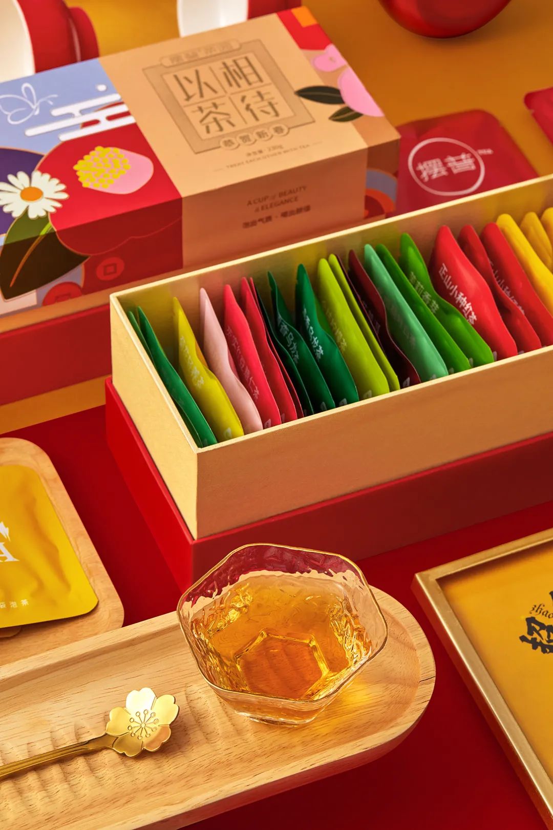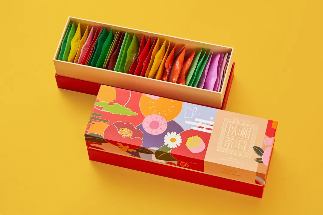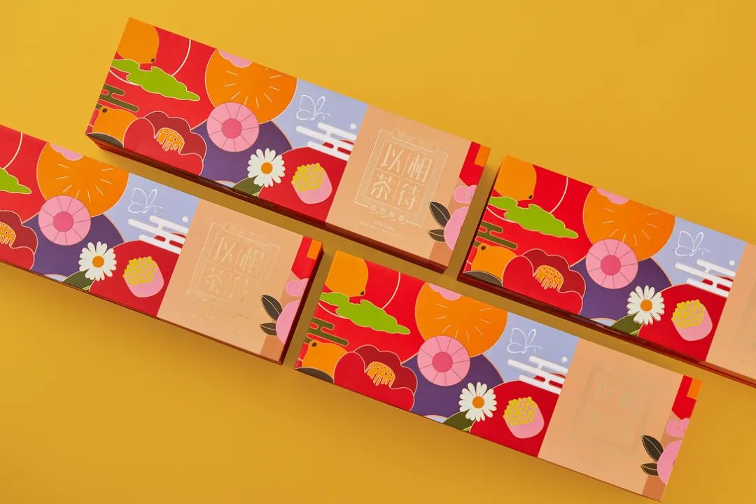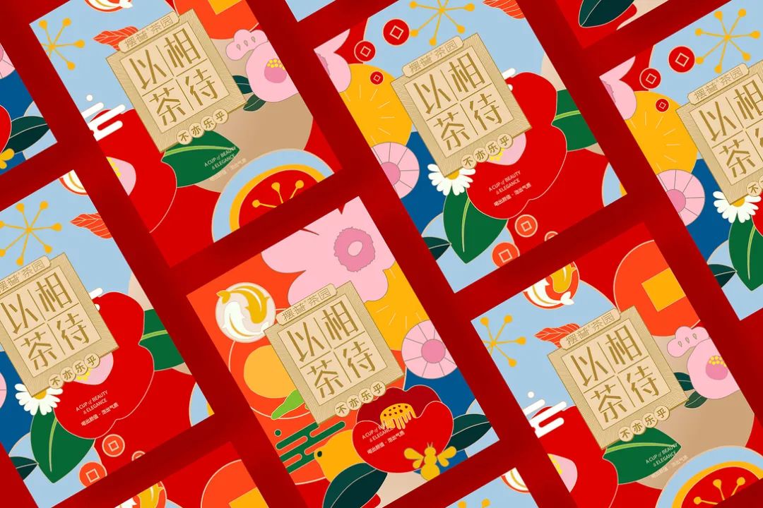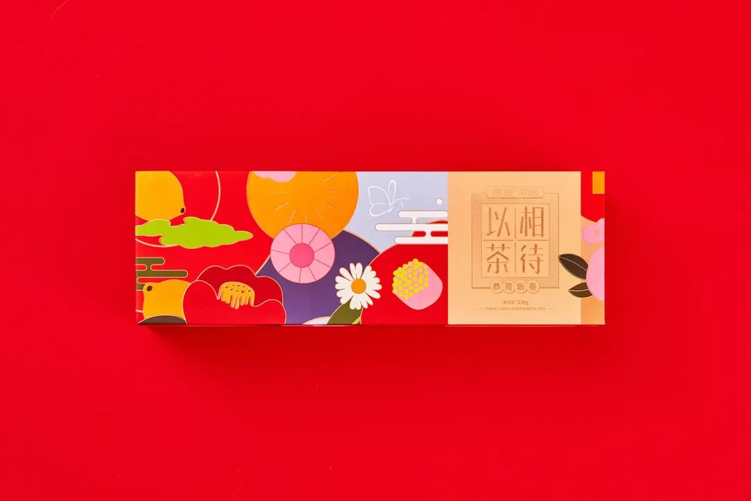 這款花茶以“以茶相待”為名,以茶相待便是以誠相待,以禮相待,體現(xiàn)了我國的傳統(tǒng)文化習俗。 包裝顏色鮮艷,用傳統(tǒng)錦鯉、祥云、銅錢的紋樣搭配現(xiàn)代抽象的花朵花蕊圖案,現(xiàn)代和傳統(tǒng)相結(jié)合,豐富的用色搭配增加了視覺張力,同時迎合了年輕人的審美。