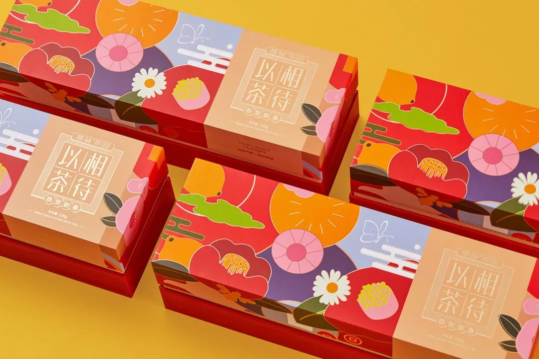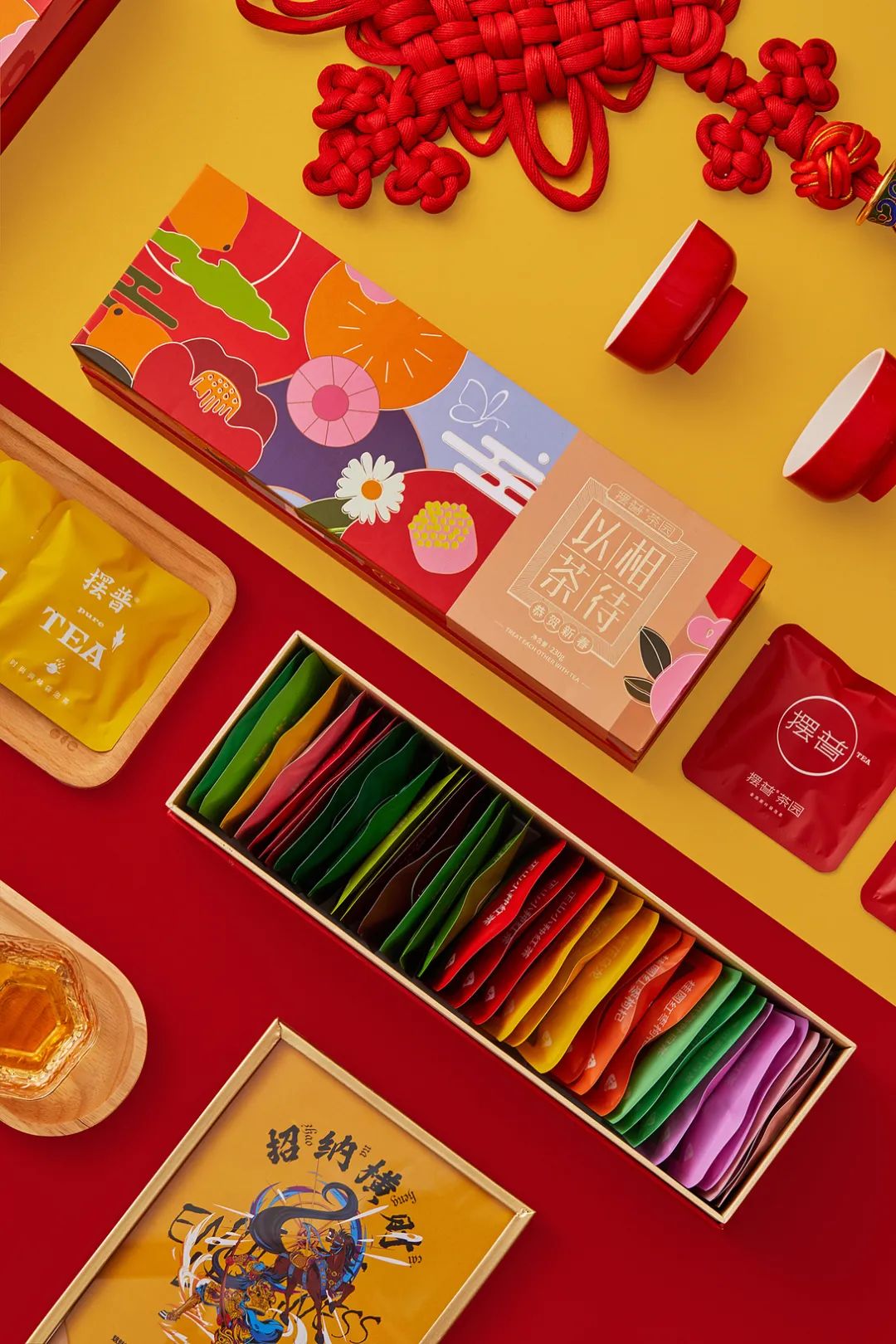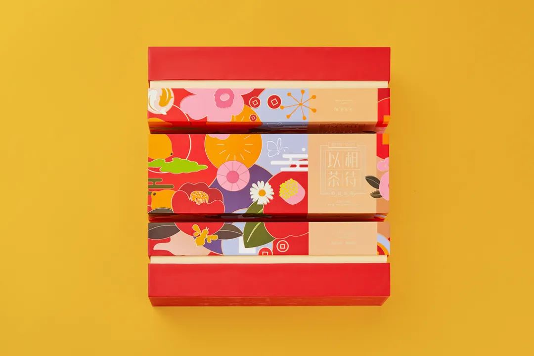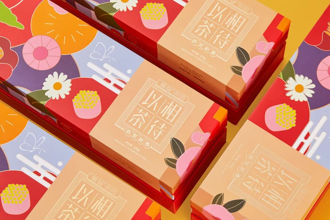 這款花茶以“以茶相待”為名,以茶相待便是以誠相待,以禮相待,體現(xiàn)了我國的傳統(tǒng)文化習俗。 包裝顏色鮮艷,用傳統(tǒng)錦鯉、祥云、銅錢的紋樣搭配現(xiàn)代抽象的花朵花蕊圖案,現(xiàn)代和傳統(tǒng)相結(jié)合,豐富的用色搭配增加了視覺張力,同時迎合了年輕人的審美。