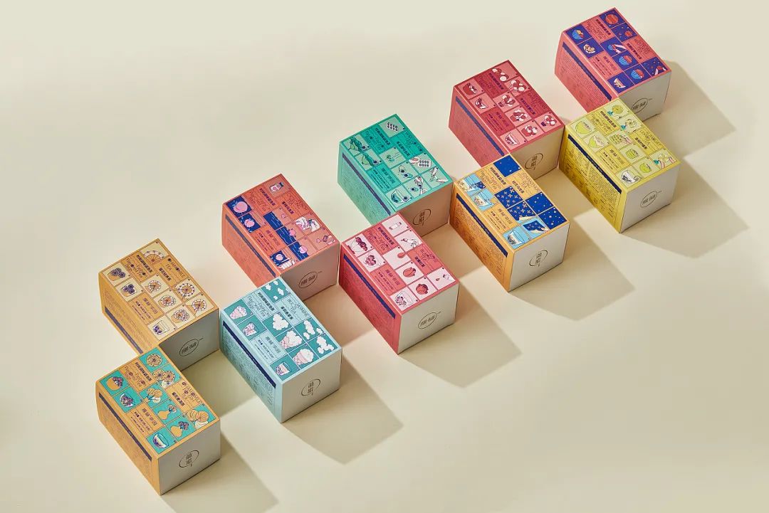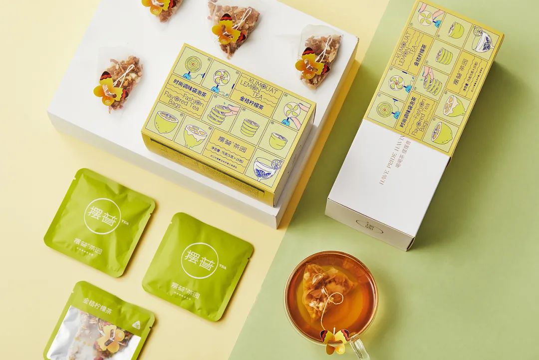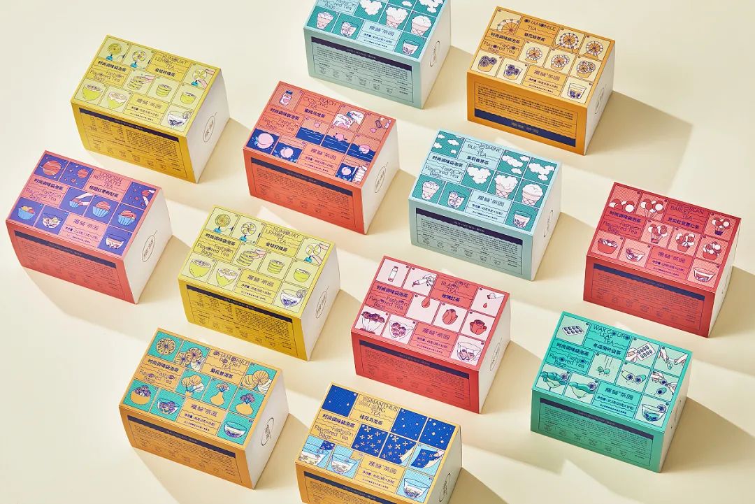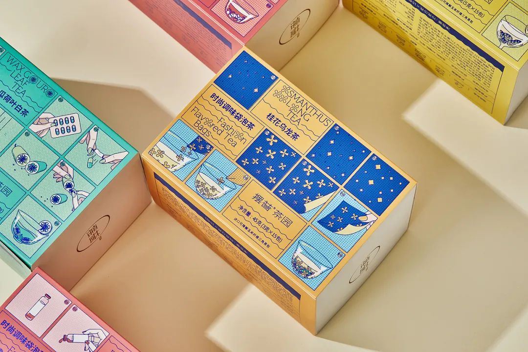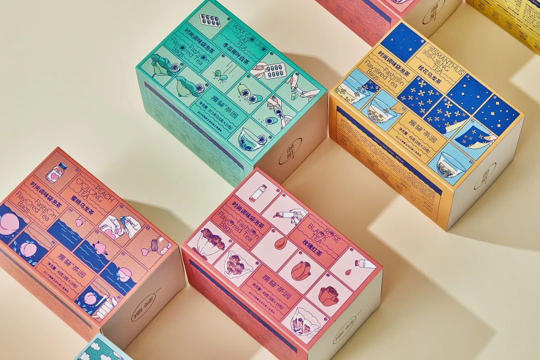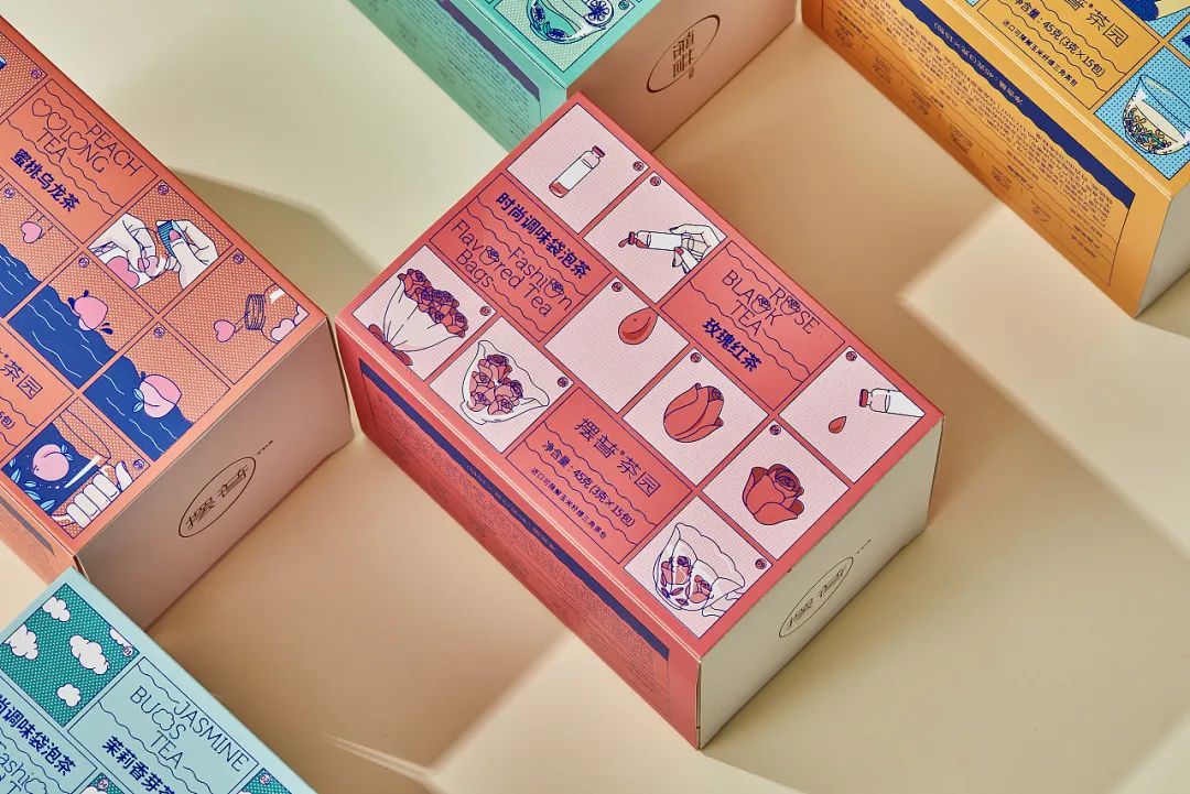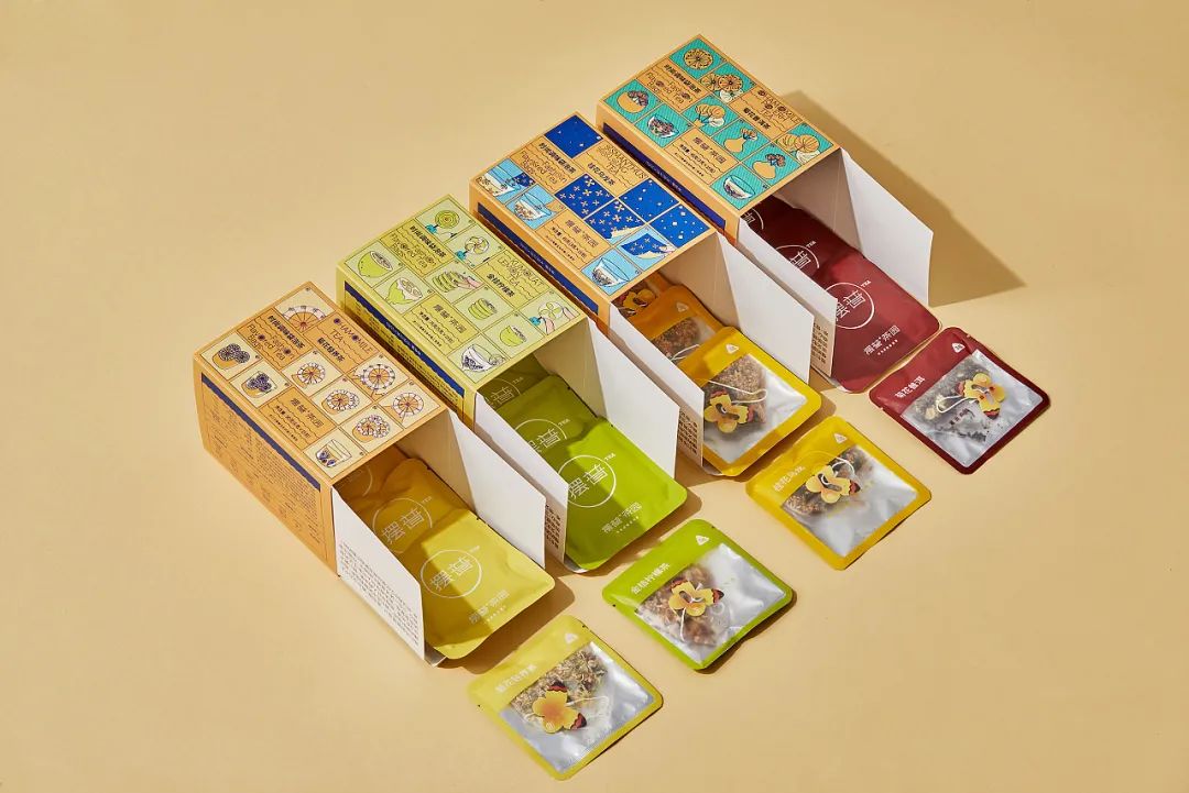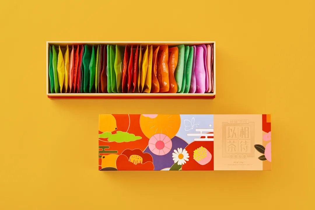 這組花茶同樣出自“擺譜”茶園,以圖案滿鋪作為包裝給人以滿滿的視覺沖擊感。用不同的顏色代表不同的口味,清新的顏色符合當下年輕人的視覺感受。